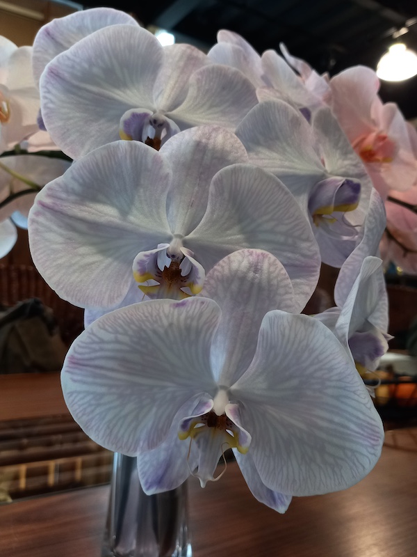 目前臺灣市面上的大型蝴蝶蘭有50%以上的大白花血統[7],而它們共同的祖先,正是被稱為「臺灣阿嬤」(Phalaenopsis amabilis)或「臺灣阿婆」(Phalaenopsis aphrodite subsp. formosana)的原生白花蝴蝶蘭。要從市面販售的大蝴蝶蘭想像生長在原棲地的白花蝴蝶蘭面貌,並不容易。一代代的育種者改良下,你能購買回家的蝴蝶蘭,花形更大更圓整、花色多變、花梗上的花數穩定,花朵壽命也越來越長,此外,消費者也注重易養性、抗病性、繁殖性……總之,我們想帶回家的花,若非奢華珍稀,最好能更遠離花的本質一點——「它們生命又短又脆弱,不夠象徵永恆」[8]。