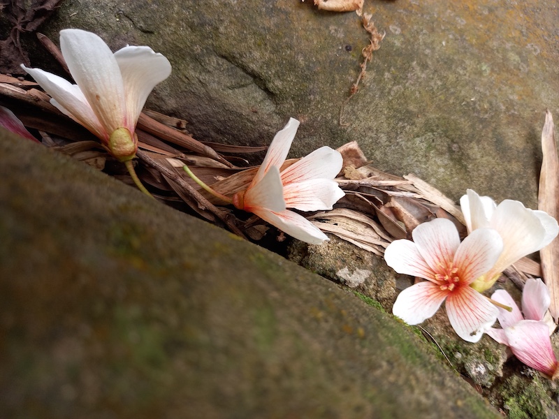 還未說完,步道泥地上赫然躺著幾朵白色五瓣花,「這棵這麼早開!」抬頭四顧,一棵胸徑約十五公分的油桐樹梢已有零星白花昂然於枝椏。黃有福的在地導覽雷達瞬間啟動,提醒我們辨識幾個油桐特徵:「樹幹看起來刺刺的,這個就是俗稱『千年桐』的油桐;掉在地上的白花整朵完整的是雄花,要是一瓣瓣分開的就是雌花;也可以觀察花蕊:雄蕊比較短,雌蕊比較長」,說罷再抬頭看看這棵迫不及待的油桐樹,「難得沿海都還沒開,它連花都落地了」。