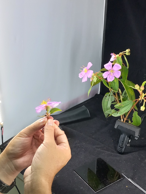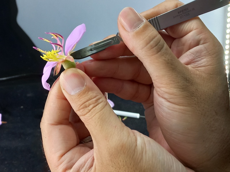 帶著三朵花綻放的野牡丹枝條回到研究室,林建融從容不迫地把枝條固定在自製攝影棚的黑幕前,先拍攝全株,再用解剖刀具小心翼翼切下一朵花,接著取下花瓣、花萼筒、苞片、長雄蕊、短雄蕊、雌蕊、子房等構造,依著科學描述的順序分別拍下正面、側面、縱切、橫切等特寫。