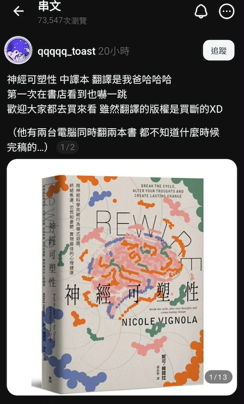 最近一次打開脆,被推送一篇有意思的內容。譯者的女兒在脆幫爸爸打書,順便幫爸爸延攬業務,非常可愛。這本《神經可塑性》一度引起我注意,在實體書店翻閱書本人後,因為裡頭闡述的概念,過去我已在其他書籍讀過,這本書的提綱挈領並不符合我增廣新知的需求,只得放手。